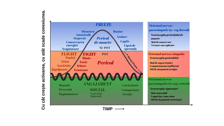 1. Nervul vag dorsal– cel mai vechi filogenetic, responsabil pentru stările de imobilizare, cum ar fi reacția de „îngheț” (freeze). Acest circuit este esențial în conservarea energiei în fața unor amenințări extreme sau situații de șoc.
